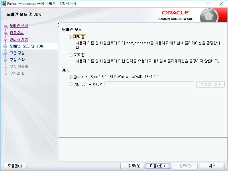 도메인 모드와 JDK를 설정합니다. 도메인 모드는 "개발", JDK 는 기본값을 사용합니다.