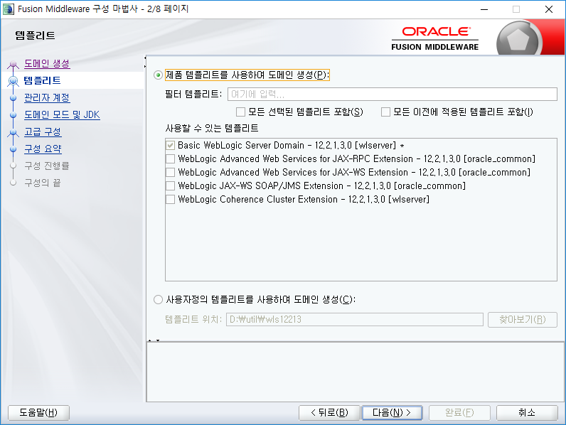 제품 템플릿을 선택합니다. 여기서는 기본 선택되어 있는 Basic WebLogic Server Domain - 12.2.1.2.0[wlserver]* 만 사용하고 다른것은 체크하지 않습니다.